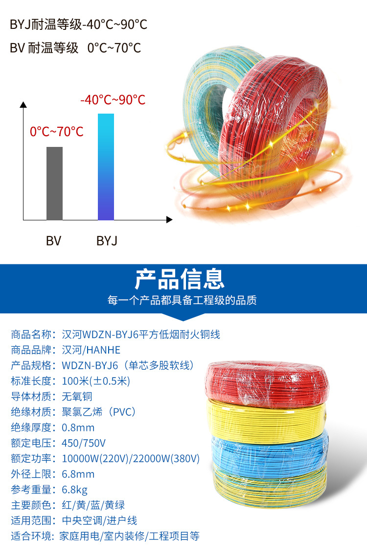 漢河電纜 WDZN-BYJ6平方輻照無鹵低煙C級耐火家裝電線空調(diào)熱水器